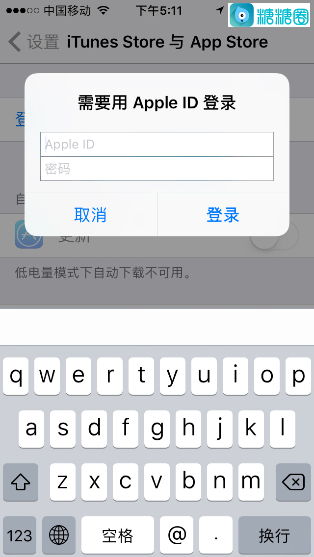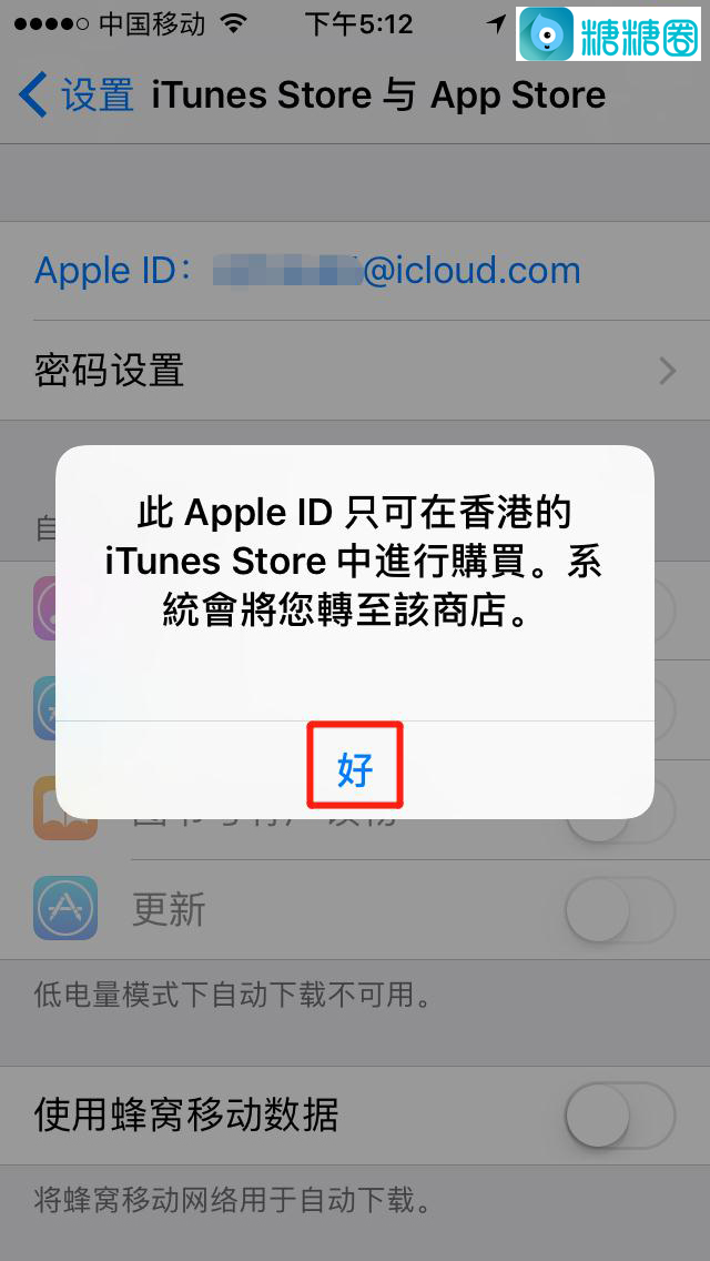 3. 填写境外的苹果ID和密码(需要向糖糖圈工作人员询问),随后跳出提示,点击“好”跳转至苹果应用商店;