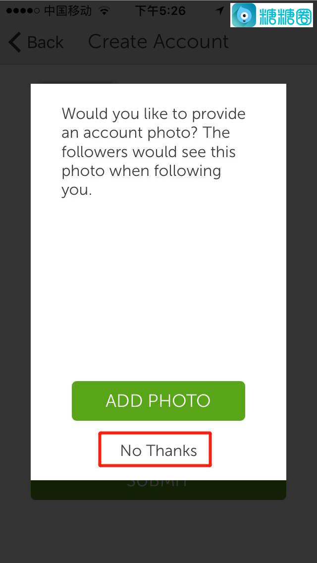 8.如果在前一页面没有上传头像则会跳出一个提示,你可以直接点“No Thanks”跳过或者点“Add Photo”添加图片;