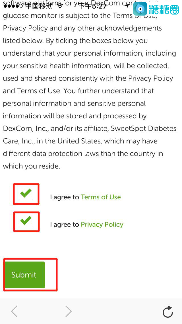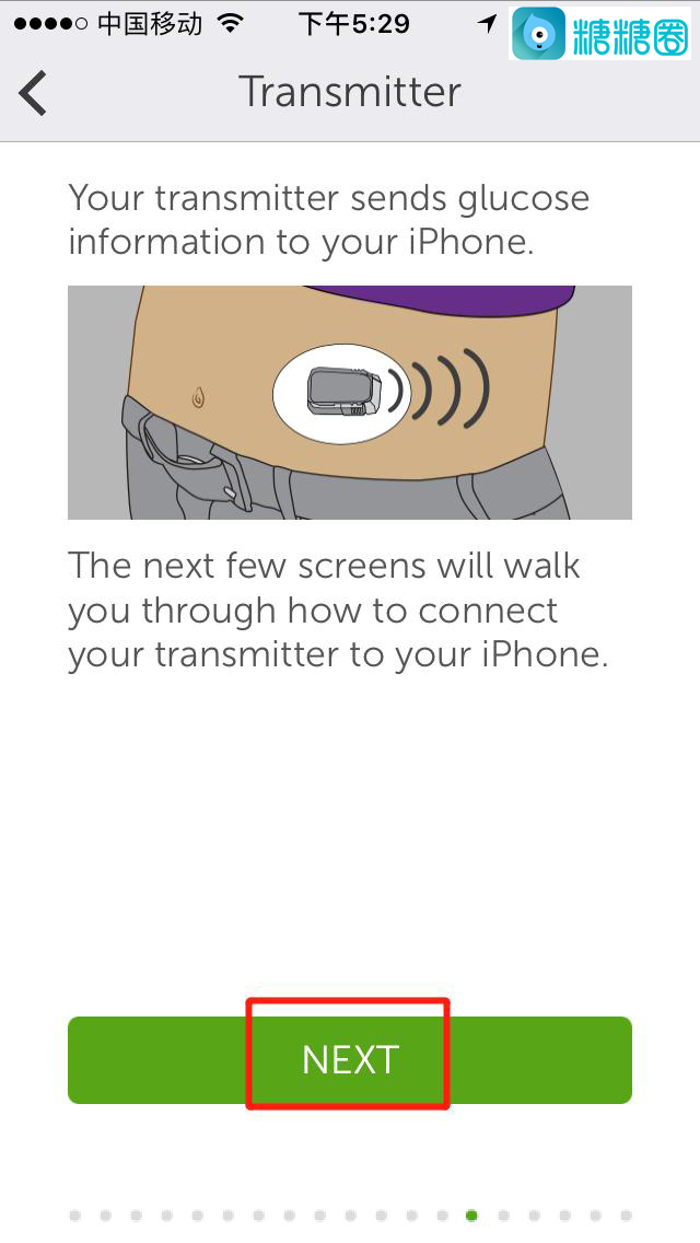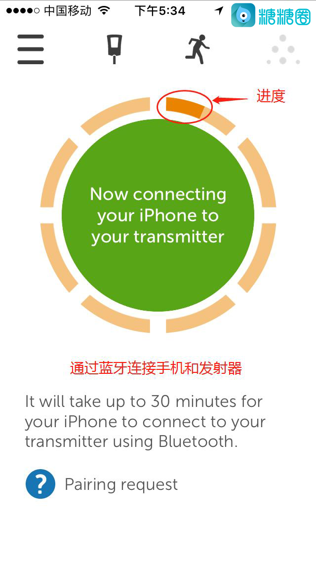 16.提前将探头扎入身体的合适部位,并将G5发射器扣在上面,等待手机发现发射器的蓝牙;蓝牙连接上后,再继续等待直到连接完毕,期间不要关掉此页面;