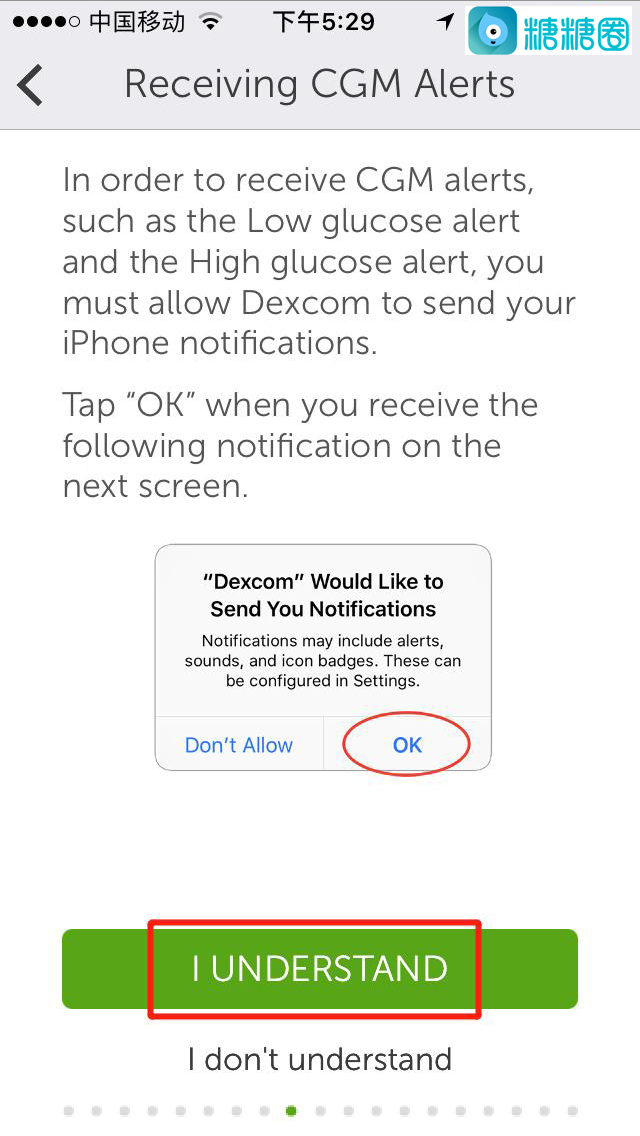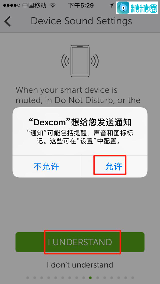 11.以下左图是提示你:你应该允许德康给你推送手机通知,因为这样才能在你高低血糖时报警,你点击“I UNDERSTAND”即可;然后点击“允许”,再点击“I UNDERSTAND”;