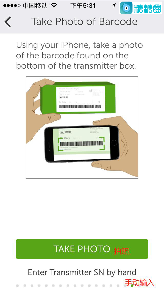 14.点击“TAKE PHOTO”,用手机相机扫描发射器包装盒上的条形码(或者手动输入发射器的SN码);