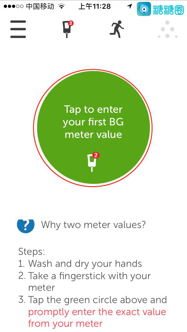 18.探头完成启动后会要求你输入两个指血以校准,连续两次点击绿色圆圈并输入指血即可完成。