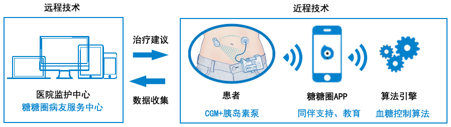 远程、近程技术是近年医疗行业发展的趋势。远程技术有各种用于T1DM管理的社交平台,如糖糖圈;近程技术中,由美国美敦力公司研发并在国外上市的670G,它集合CGMS、胰岛素泵及算法控制器,实现了胰岛素基础率的自动化调整,但餐前、纠正大剂量仍需手动输入,这一新型胰岛素泵为实现闭环式血糖监测治疗(人工胰腺)迈开重要的一步。