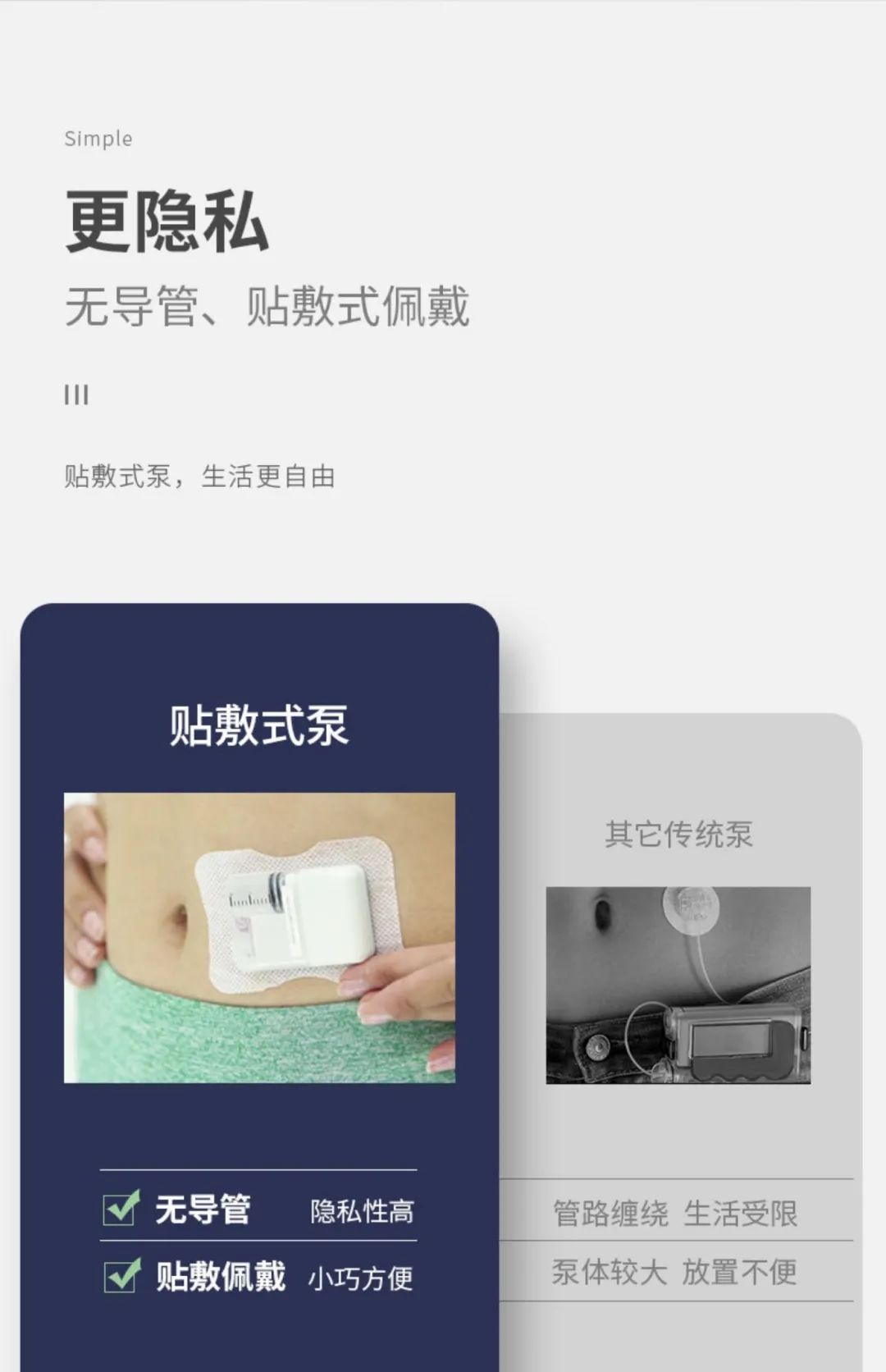 无导管的设计理念,把胰岛素泵用户从传统泵的管路问题中解放出来,在隐私度上得到提升,夏天不再害怕短袖,不用担心外出会被投来异样眼光,对患糖尿病的年轻群体特别友好。