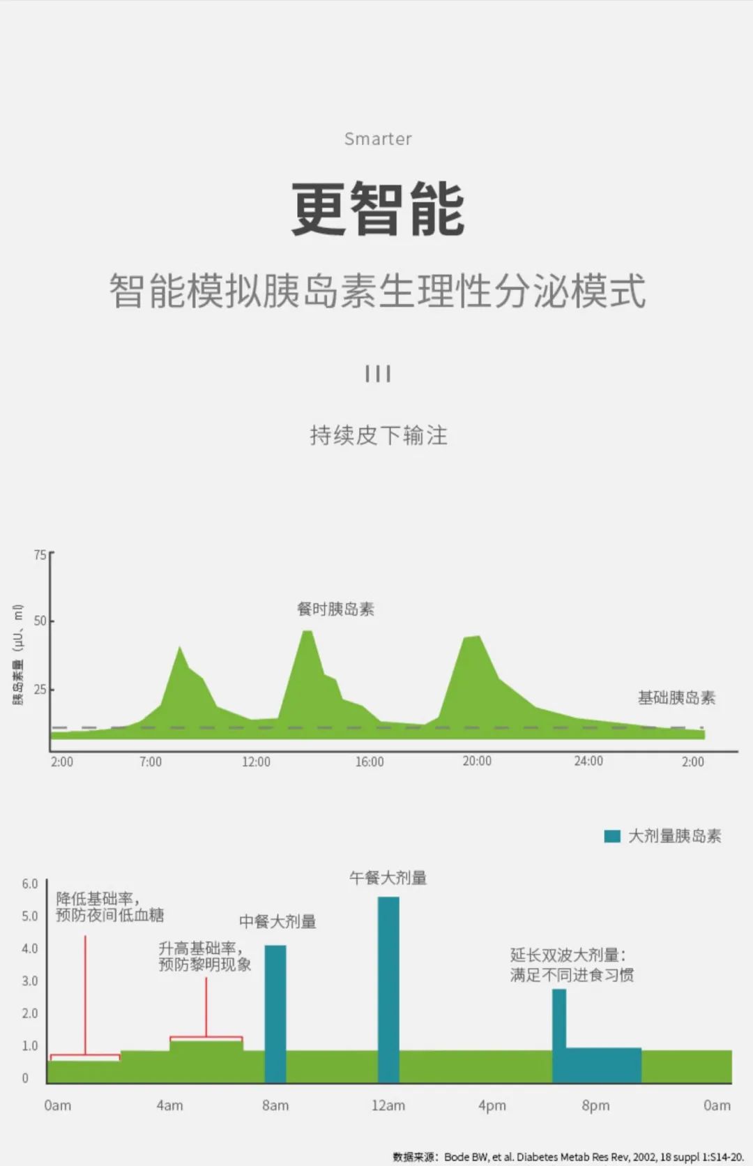 在模拟胰岛素分泌的过程中,考虑到“黎明现象”带来的血糖过高情况,设计了分段基础率,微泰贴泵基础率最多可以分48段,按照不同时间设置基础率——夜间降低基础率,预防睡着时低血糖;黎明时分升高基础率,降低“黎明现象”带来的高血糖。科学有效地帮助患者把血糖控制在一个平稳的状态。