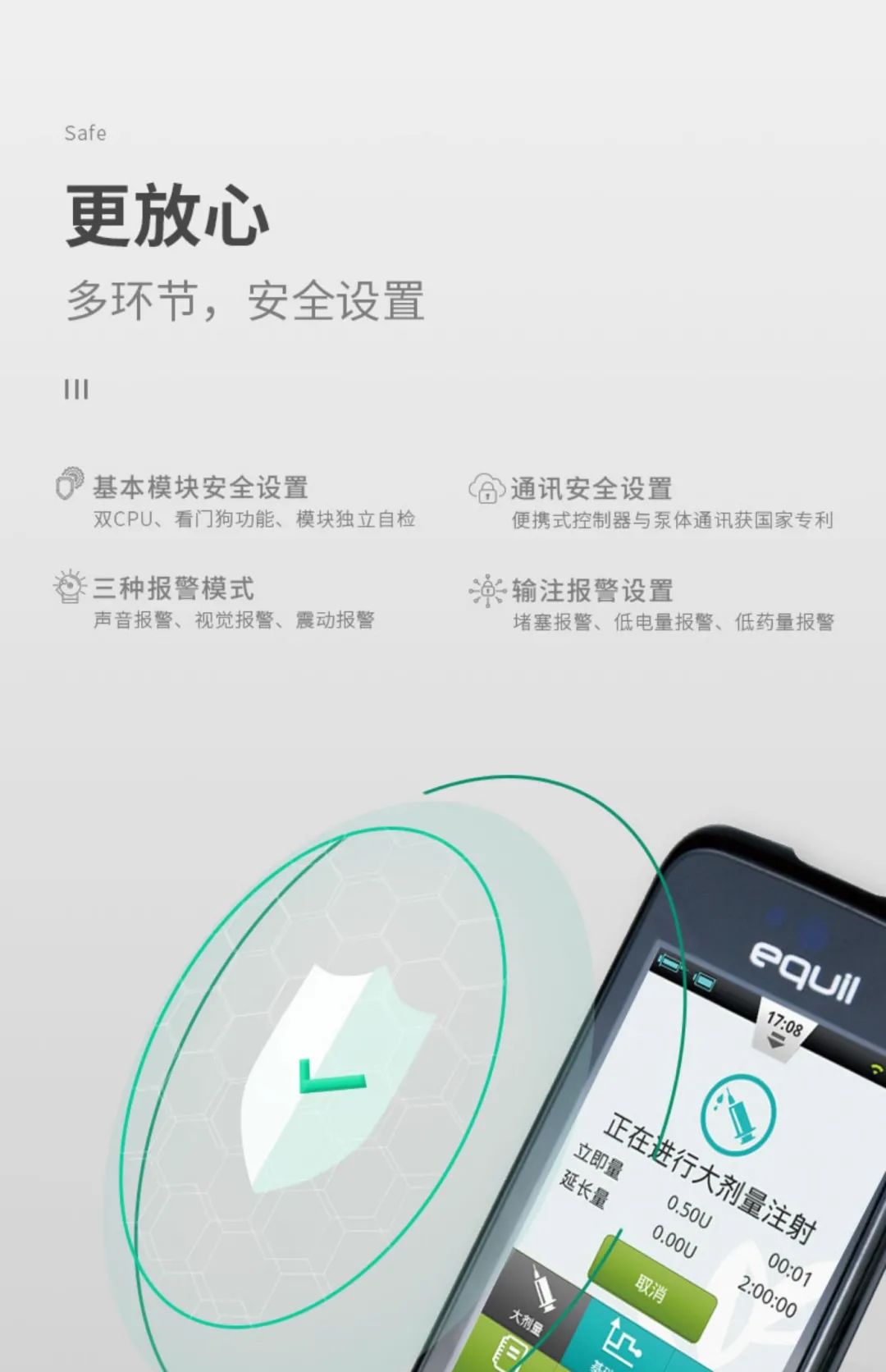 微泰在设计生产医疗器械时,始终把产品安全性摆在第一位,始终以负责任的态度为用户身体健康服务。为此从多个维度加入不同级别的安全设置,考虑可能出现的不同情况,比如堵塞、低电量、低药量等情况发出警报预警,同时在警报预警时考虑到不同人群对警报模式的喜好和方便程度,又设置了声音报警、视觉报警、震动报警。