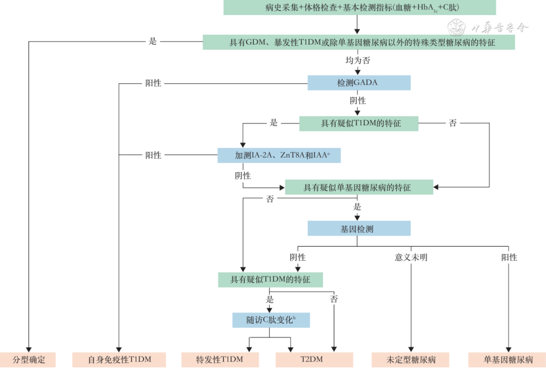 首先根据病史、体格检查和基本检测指标(血糖、HbA1c及C肽)等,明确是否为GDM、暴发性T1DM或除单基因糖尿病以外的特殊类型糖尿病。