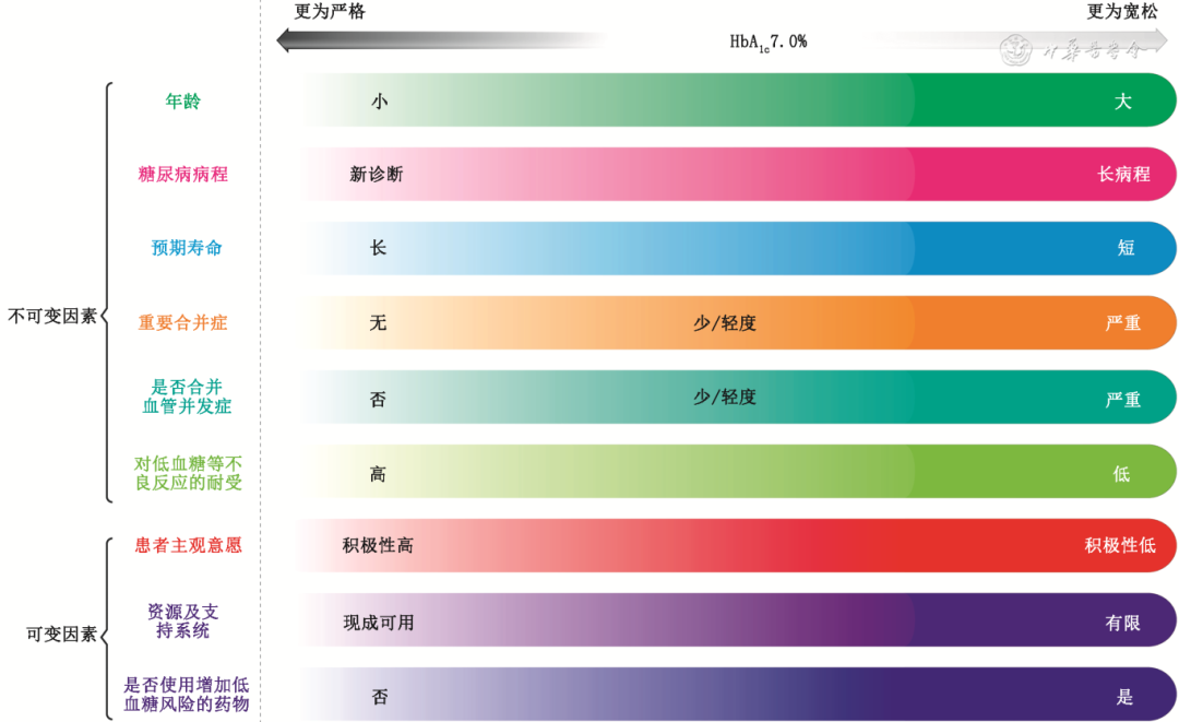 在成人T2DM个体化HbA1c控制目标设定的主要影响因素中,将不可变因素的“合并症”及“并发症”分别更改为“严重合并症”及“是否合并血管并发症”,表述更严谨。